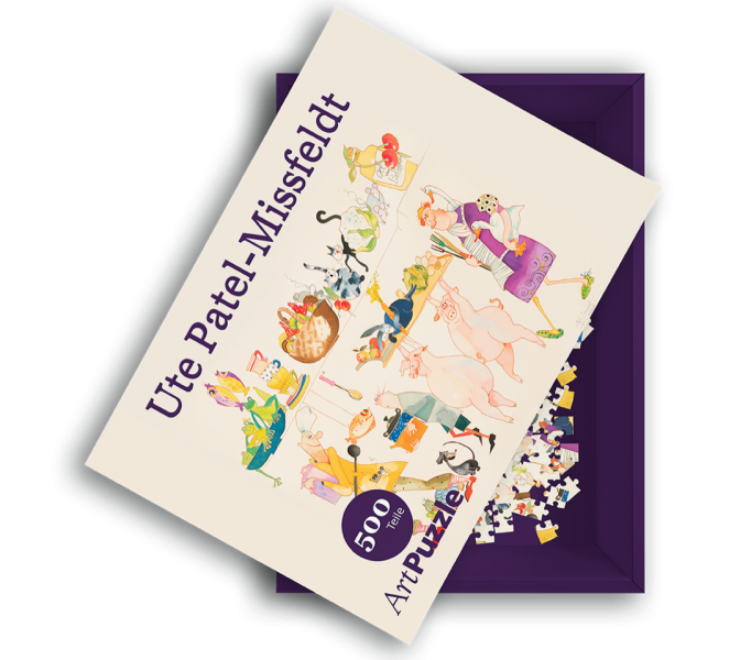 Dieses Puzzle zeigt eine Karikatur eines Küchen-Motivs, das von der Künstlerin Ute Patel-Missfeldt auf Seide gemalt wurde. Die fröhlichen Figuren spiegeln das Küchenleben wider und bringen den Betrachter zum Schmunzeln. Die vielseitige Künstlerin lebt in einem Schloss in Bayern, ihre eigene Küche ist mit vielen solcher Karikaturen ausgestaltet.
